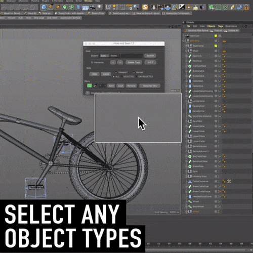 Hide and Seek gives you instant control over even the most complex Cinema 4D scenes by letting you find and select anything in your Object Manager in seconds. No more hunting, scrolling, or expanding endless hierarchies just to find what you need.