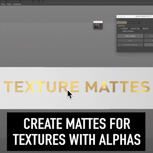 Quick Matte Pro is essential for an optimized and fast workflow and will change the way you work in Cinema 4D! Quick Matte Pro has been designed to take care of all your matting & object buffer needs quickly and efficiently without having to worry about all the setup. Set your mattes, add object buffers, and add every single object buffer in your scene to your multipass render settings with just a single click!